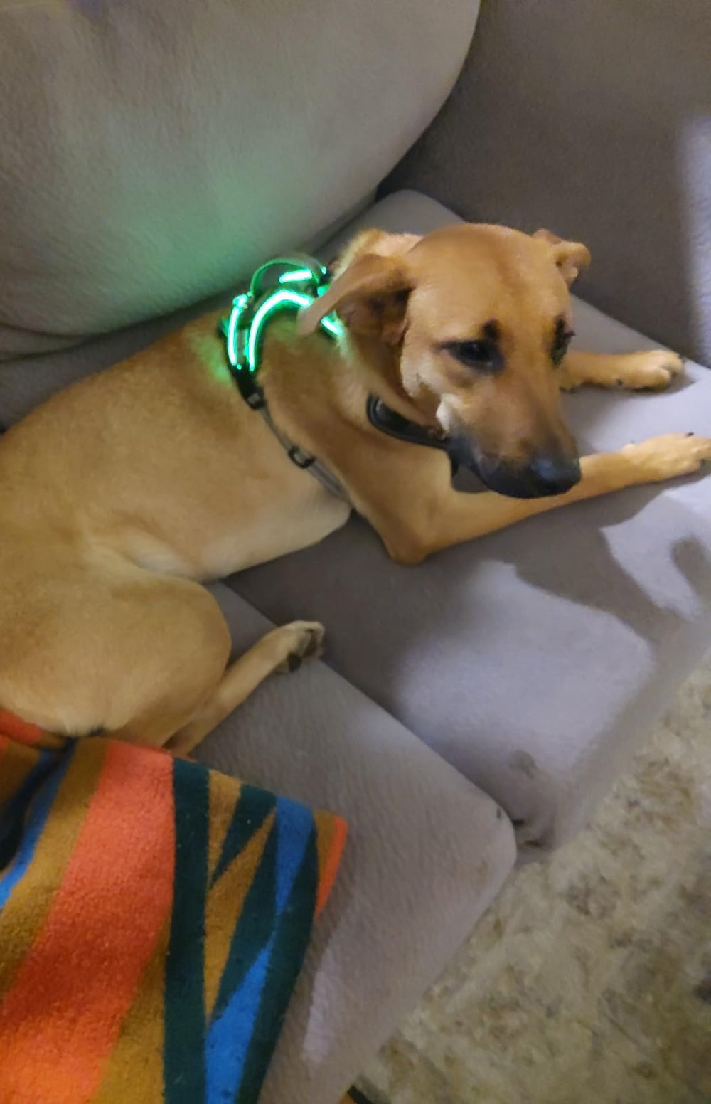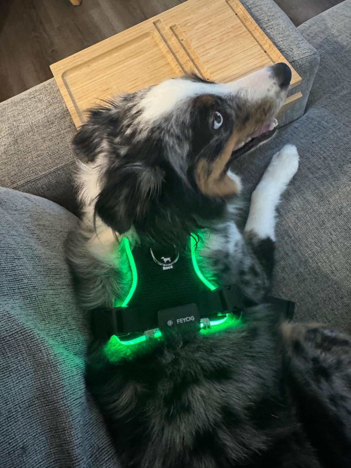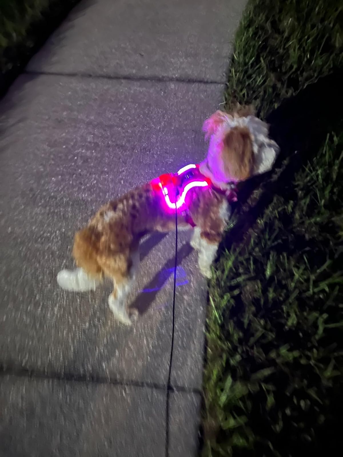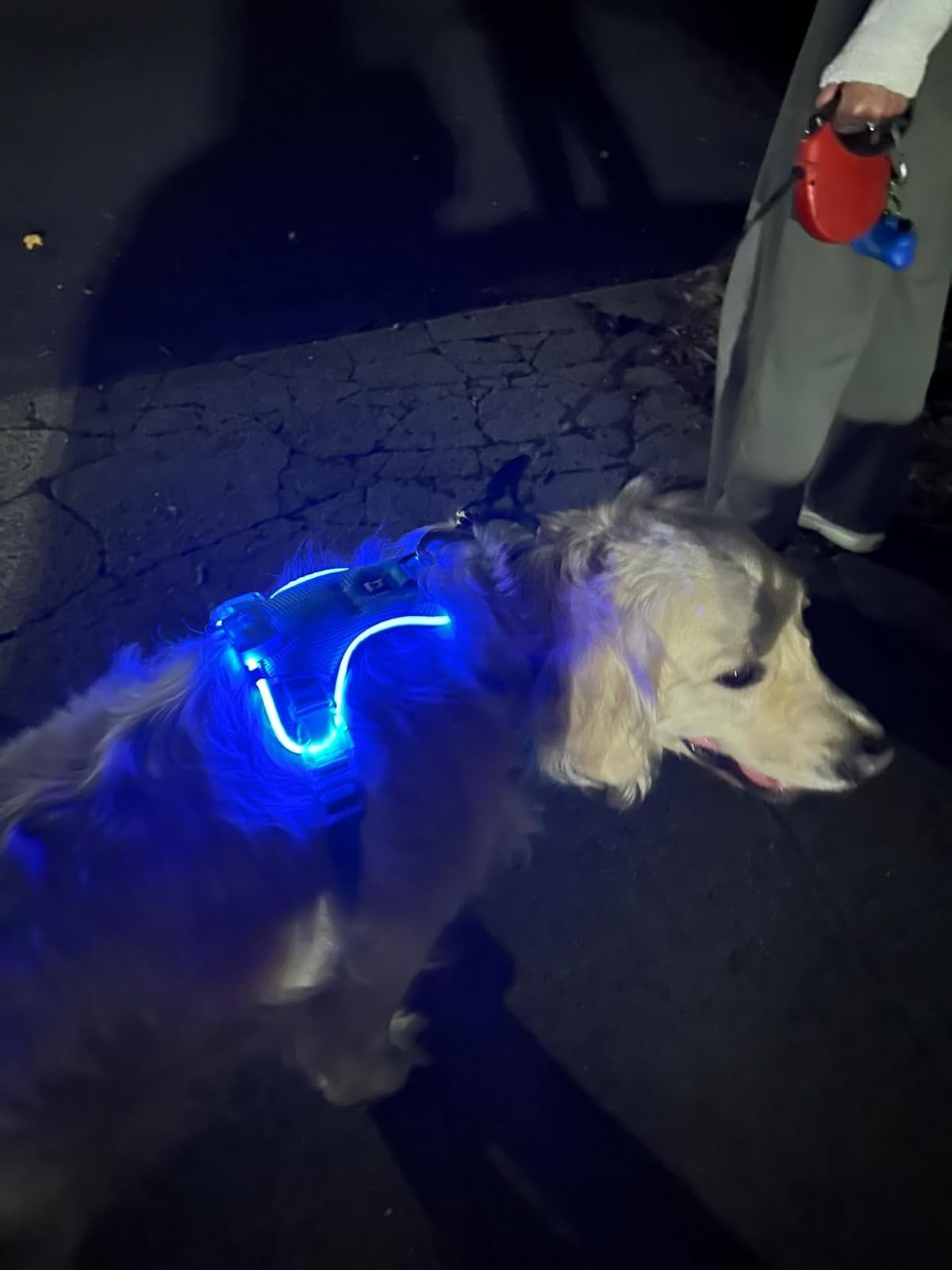 Es bien brillante, así que se ve súper bien incluso cuando está todo oscuro. El arnés es de buena calidad y resistente. Ahora salimos mucho más tranquilos con nuestro perro en la noche.